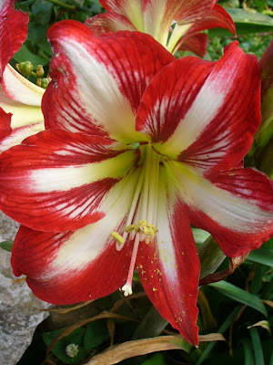 Mas não, ninguém sacudiu flores, e também não fui eu que salpiquei estas. Desde há dois anos que tenho este Hippeastrum, e cada vez mais me surpreende pela tendência das flores em se tornarem "não tão artificiais", percebem? Parece que querem voltar às origens. Conseguirão?